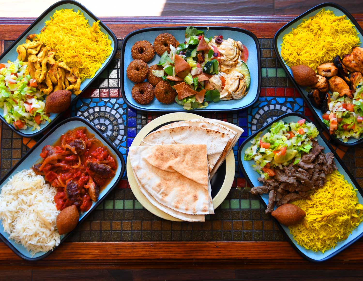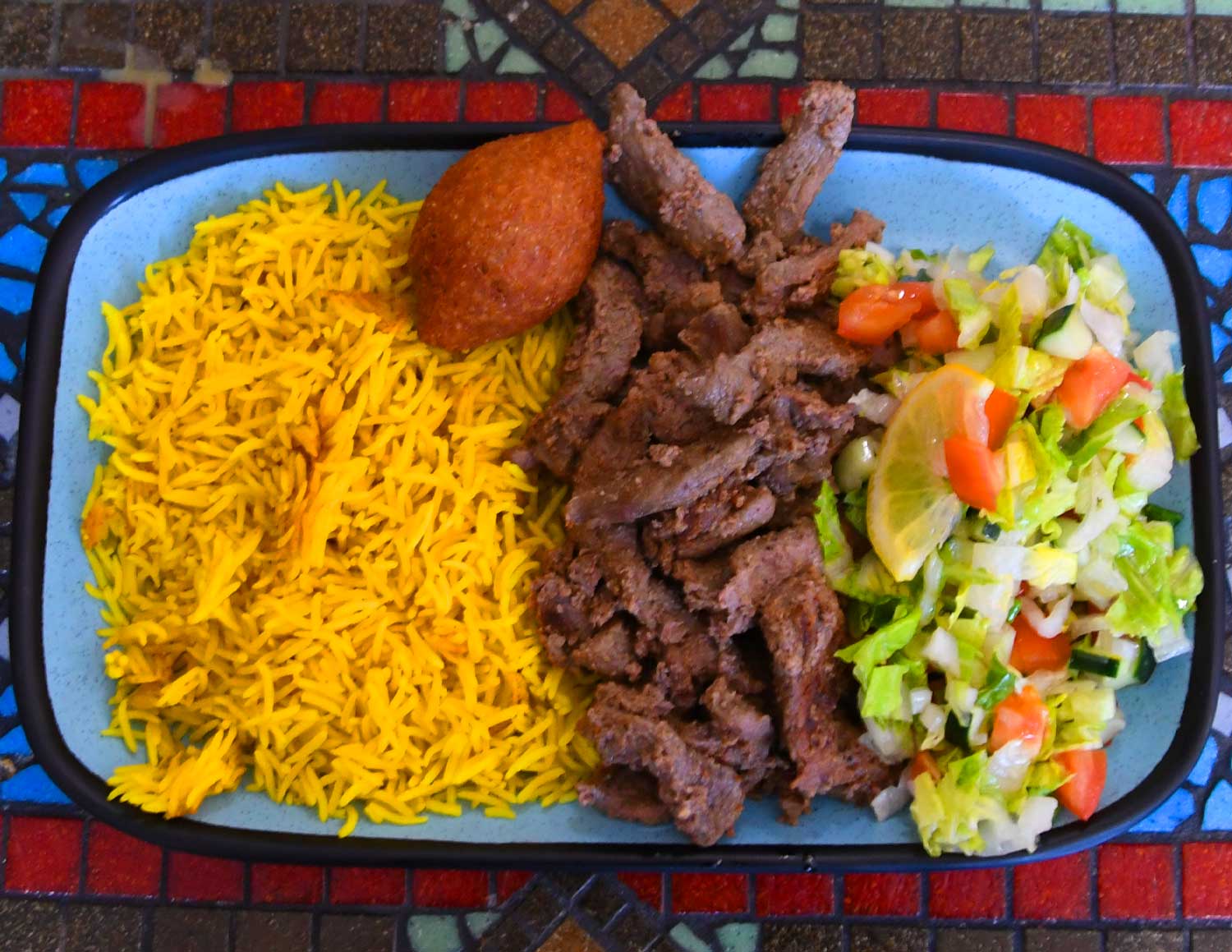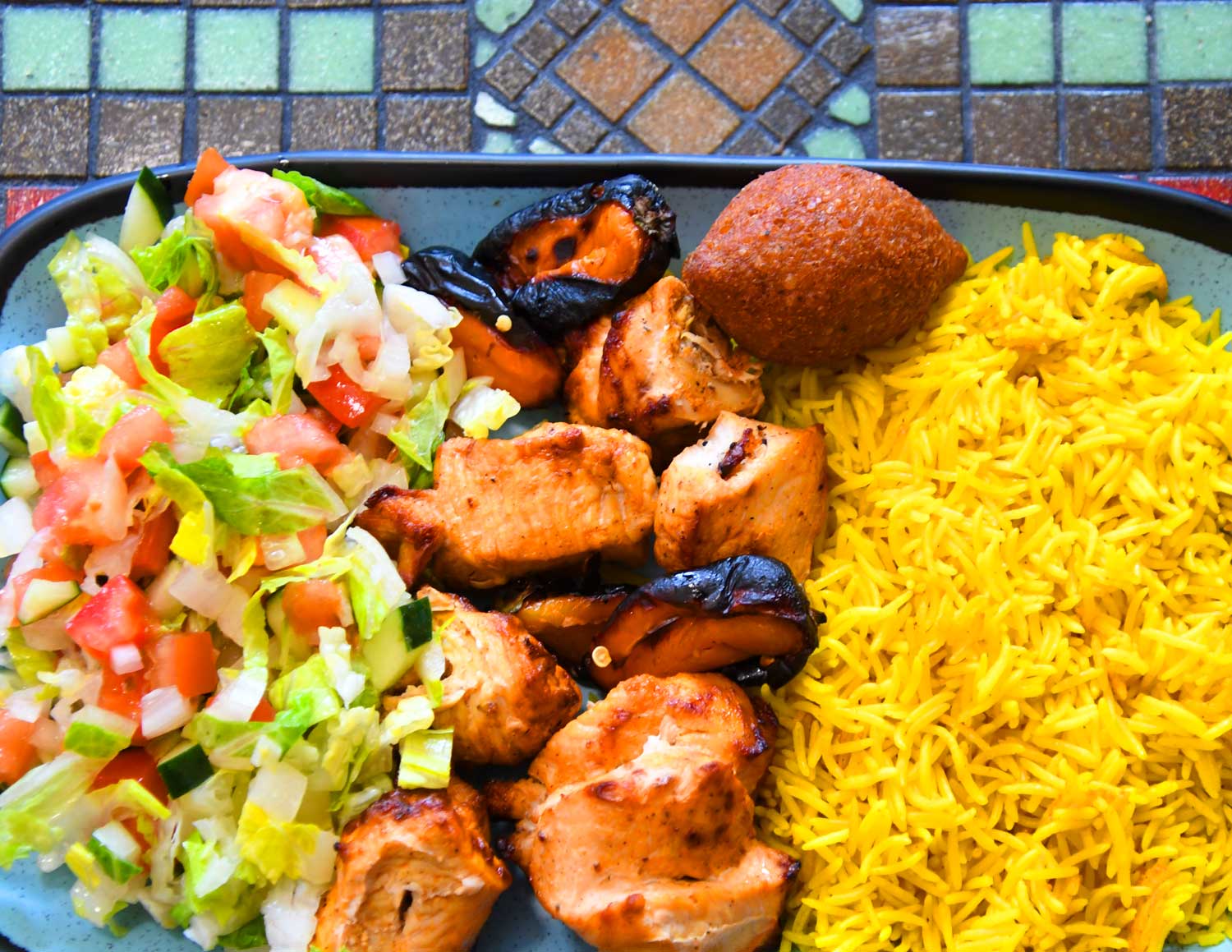 Choice of chicken shawarma, chicken shish kabobs, or beef shawarma (+$2), served with yellow rice, one kibbeh, and your choice of fattoush or garden salad.